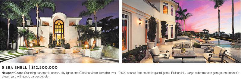 Newport Coast: Stunning panoramic ocean, city lights and Catalina views from this over 10,000 square foot estate in guard-gated Pelican Hill. Large subterranean garage, entertainer’s dream yard with pool, barbecue, etc.