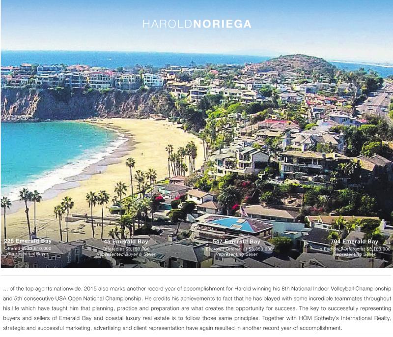 ... of the top agents nationwide. 2015 also marks another record year of accomplishment for Harold winning his 8th National Indoor Volleyball Championship and 5th consecutive USA Open National Championship. He credits his achievements to fact that he has played with some incredible teammates throughout his life which have taught him that planning, practice and preparation are what creates the opportunity for success. The key to successfully representing buyers and sellers of Emerald Bay and coastal luxury real estate is to follow those same principles. Together with HÔM Sotheby’s International Realty, strategic and successful marketing, advertising and client representation have again resulted in another record year of accomplishment.
