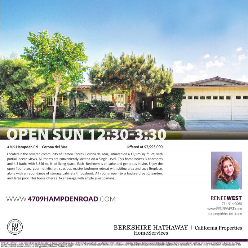 O SU :30 3:30 4709 Hampden Rd | Corona del Mar Offered at $3,995,000 WWW.4709HAMPDENROAD.COM RENEEWEST 714.914.9060 www.RENEEWEST.com renee@bhhscdm.com ©201 BHH Affiliates, LLC. An independently operated subsidiary of HomeServices of America, Inc., aBerkshire Hathaway affiliate, and afranchiseeofBHH Affiliates, LLC. Berkshire Hathaway HomeServices and the Berkshire Hathaway HomeServices symbol are registered service marks of HomeServices of America, Inc.® Equal Housing Opportunity. Berkshire Hathaway HomeServices does not guarantee the accuracy of square footage, lot size or other information concerning the condition or features of property provided by the seller or obtained from public records or other sources, and the buyer is advised to independently verify the accuracy of that information through personal inspection and with appropriate professionals. CalBRE# 01079959