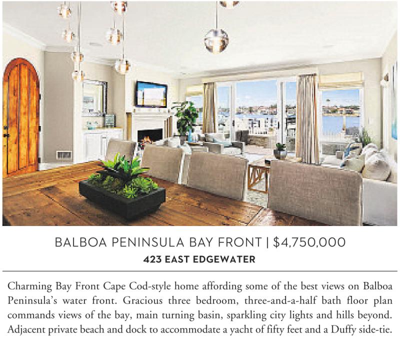 BALBOA PENINSULA BAY FRONT | $4,750,000 423 EAST EDGEWATER Charming Bay Front Cape Cod-style home affording some of the best views on Balboa Peninsula’s water front. Gracious three bedroom, three-and-a-half bath floor plan commands views of the bay, main turning basin, sparkling city lights and hills beyond. Adjacent private beach and dock to accommodate a yacht of fifty feet and a Duffy side-tie.