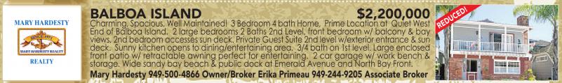 MARYHARDESTY REALTY BALBOA ISLAND $2,200,000 Charming, Spacious, Well Maintained! 3 Bedroom 4 bath Home, Prime Location at Quiet West End of Balboa Island. 2 large bedrooms 2 Baths 2nd Level, front bedroom w/ balcony & bay views, 2nd bedroom accesses sun deck. Private Guest Suite 2nd level w/exterior entrance & sun deck. Sunny kitchen opens to dining/entertaining area. 3/4 bath on 1st level. Large enclosed front patio w/ retractable awning perfect for entertaining. 2 car garage w/ work bench &storage. Wide sandy bay beach & public dock at Emerald Avenue and North Bay Front. Mary Hardesty 949-500-4866 Owner/Broker Erika Primeau 949-244-9205 Associate Broker