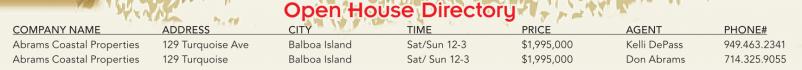 COMPANY NAME ADDRESS CITY TIME PRICE AGENT PHONE# Abrams Coastal Properties 129 Turquoise Ave Balboa Island Sat/Sun 12-3 $1,995,000 Kelli DePass 949.463.2341 Abrams Coastal Properties 129 Turquoise Balboa Island Sat/ Sun 12-3 $1,995,000 Don Abrams 714.325.9055