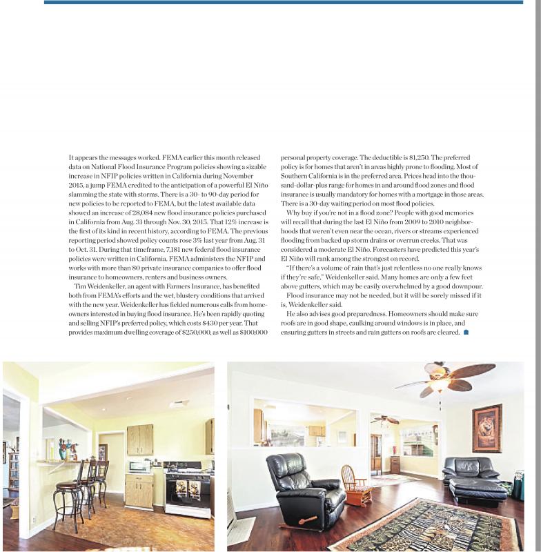 TimWeidenkeller,anagent with Farmers Insurance, has benefited both from FEMA’s efforts and the wet, blustery conditions that arrived with the newyear.Weidenkeller has fielded numerous calls from homeowners interested in buying flood insurance. He’s been rapidlyquoting and selling NFIP’spreferred policy, which costs $430 per year.That provides maximum dwelling coverageof$250,000,aswell as $100,000