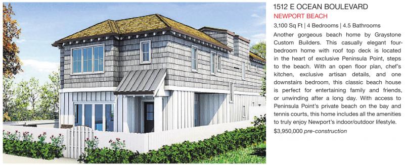1512 E OCEAN BOULEVARD NEWPORT BEACH 3,100 Sq Ft | 4 Bedrooms | 4.5 Bathrooms Another gorgeous beach home by Graystone Custom Builders. This casually elegant fourbedroom home with roof top deck is located in the heart of exclusive Peninsula Point, steps kitchen, exclusive artisan details, and one downstairs bedroom, this classic beach house is perfect for entertaining family and friends, or unwinding after a long day. With access to tennis courts, this home includes all the amenities $3,950,000 pre-construction