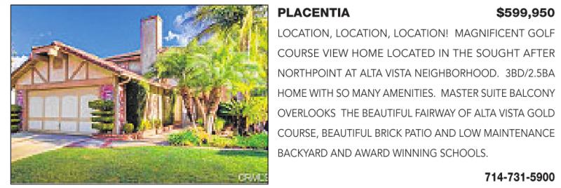 PLACENTIA $599,950 LOCATION, LOCATION, LOCATION! MAGNIFICENT GOLF COURSE VIEW HOME LOCATED IN THE SOUGHT AFTER NORTHPOINT AT ALTA VISTA NEIGHBORHOOD. 3BD/2.5BA HOME WITH SO MANY AMENITIES. MASTER SUITE BALCONY OVERLOOKS THE BEAUTIFUL FAIRWAY OFALTAVISTA GOLD COURSE, BEAUTIFUL BRICK PATIO AND LOW MAINTENANCE BACKYARD AND AWARD WINNING SCHOOLS. 714-731-5900