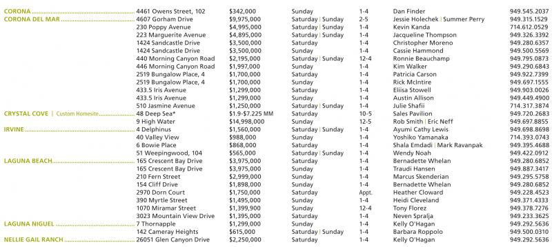 CORONA............................................................ 4461 Owens Street, 102 $342,000 Sunday 1-4 Dan Finder 949.545.2037 CORONA DEL MAR........................................... 4607 Gorham Drive $9,975,000 Saturday | Sunday 2-5 Jessie Holechek | Summer Perry 949.315.1529 230 Poppy Avenue $4,995,000 Saturday | Sunday 1-4 Kevin Kanda 714.612.0529 223 Marguerite Avenue $4,895,000 Saturday | Sunday 1-4 Jacqueline Thompson 949.326.3392 1424 Sandcastle Drive $3,500,000 Saturday 1-4 Christopher Moreno 949.280.6357 1424 Sandcastle Drive $3,500,000 Sunday 1-4 Cassie Hammond 949.500.5569 440 Morning Canyon Road $2,195,000 Saturday | Sunday 12-4 Ronnie Beauchamp 949.795.0873 446 Morning Canyon Road $1,997,000 Sunday 1-4 Kim Walker 949.290.6843 2519 Bungalow Place, 4 $1,700,000 Saturday 1-4 Patricia Carson 949.922.7399 2519 Bungalow Place, 4 $1,700,000 Sunday 1-4 Rick McIntire 949.697.1555 433.5 Iris Avenue $1,299,000 Saturday 1-4 Eliisa Stowell 949.903.0026 433.5 Iris Avenue $1,299,000 Sunday 1-4 Austin Allison 949.449.4900 510 Jasmine Avenue $1,250,000 Saturday | Sunday 1-4 Julie Shafii 714.317.3874 CRYSTAL COVE | Custom Homesite..................... 48 Deep Sea* $1.9-$7.225 MM Saturday 10-5 Sales Pavilion 949.720.2683 9 High Water $14,998,000 Sunday 12-5 Rob Smith | Eric Neff 949.697.8855 IRVINE................................................................ 4 Delphinus $1,560,000 Saturday | Sunday 1-4 Ayumi Cathy Lewis 949.698.8698 40 Valley View $988,000 Sunday 1-4 Yoshiko Yamanaka 714.393.0743 6 Bowie Place $868,000 Saturday 1-4 Shala Emdadi | Mark Ravanpak 949.395.4688 51 Weepingwood, 104 $565,000 Saturday | Sunday 1-4 Wendy Noah 949.422.0912 LAGUNA BEACH................................................ 165 Crescent Bay Drive $3,975,000 Saturday 1-4 Bernadette Whelan 949.280.6852 165 Crescent Bay Drive $3,975,000 Sunday 1-4 Traudi Hansen 949.887.3417 210 Fern Street $2,999,000 Sunday 1-4 Marcus Skenderian 949.295.5758 154 Cliff Drive $1,898,000 Sunday 1-4 Bernadette Whelan 949.280.6852 2970 Dorn Court $1,750,000 Saturday Appt. Heather Cloward 949.228.4523 390 Myrtle Street $1,495,000 Sunday 1-4 Heidi Cleveland 949.371.4333 1070 Miramar Street $1,399,900 Sunday 12-4 Tony Florez 949.378.7276 3023 Mountain View Drive $1,395,000 Saturday 1-4 Neven Spralja 949.233.3625 LAGUNA NIGUEL.............................................. 7 Thornapple $1,299,000 Sunday 1-4 Kelly O'Hagan 949.292.5636 142 Cameray Heights $615,000 Saturday | Sunday 1-4 Barbara Roppolo 949.500.0310 NELLIE GAIL RANCH ......................................... 26051 Glen Canyon Drive $2,250,000 Saturday 1-4 Kelly O'Hagan 949.292.5636