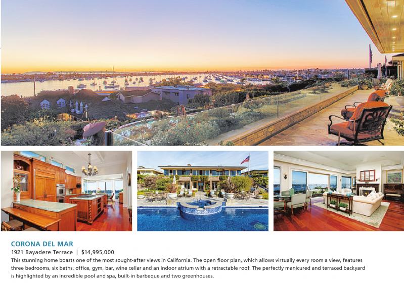 CORONA DEL MAR 1921 Bayadere Terrace | $14,995,000 This stunning home boasts one of the most sought-after views in California. The open floor plan, which allows virtually every room a view, features three bedrooms, six baths, office, gym, bar, wine cellar and an indoor atrium with a retractable roof. The perfectly manicured and terraced backyard is highlighted by an incredible pool and spa, built-in barbeque and two greenhouses. See also