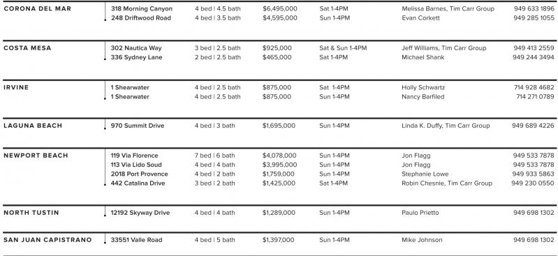 CORONA DEL MAR 318 Morning Canyon 248 Driftwood Road COSTA MESA 302 Nautica Way 336 Sydney Lane IRVINE 1 Shearwater 1 Shearwater LAGUNA BEACH 970 Summit Drive NEWPORT BEACH 119 Via Florence 113 Via Lido Soud 2018 Port Provence 442 Catalina Drive NORTH TUSTIN 12192 Skyway Drive SAN JUAN CAPISTRANO 33551 Valle Road