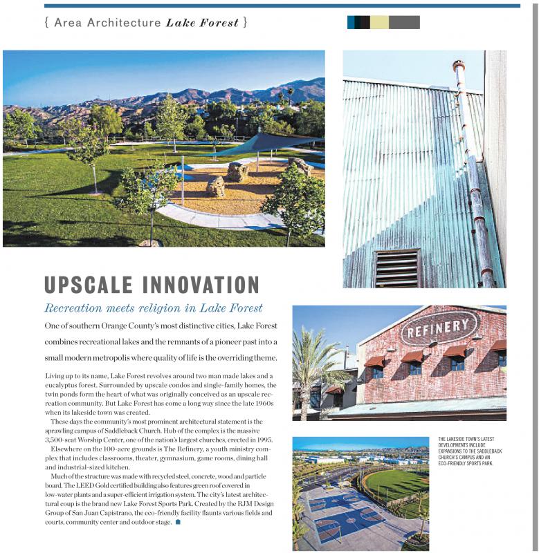 Much of the structurewas made with recycled steel, concrete, wood and particle board. The LEED Gold certified building also features green roof coveredin low-water plants and asuper-efficient irrigation system. The city’s latestarchitectural coup is the brand newLakeForestSports Park. Created by the RJMDesign Group of San Juan Capistrano,the eco-friendlyfacility flaunts various fields and courts,community center and outdoor stage.