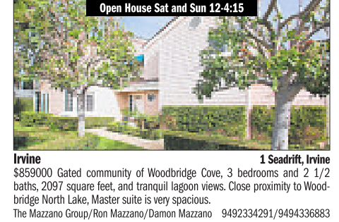 Irvine 1Seadrift, Irvine $859000 Gated community of Woodbridge Cove, 3 bedrooms and 2 1/2 baths, 2097 square feet,and tranquil lagoon views. Close proximity to WoodbridgeNorth Lake,Mastersuite is very spacious.