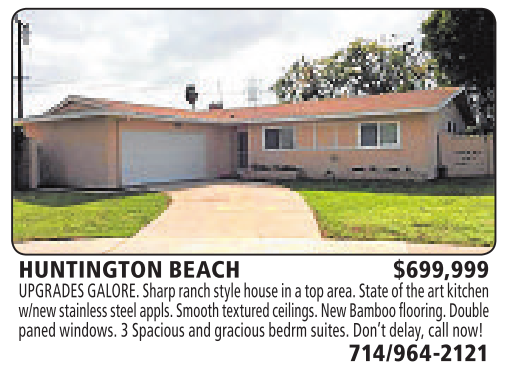 HUNTINGTON BEACH $699,999 UPGRADES GALORE. Sharpranch stylehouseinatop area.State of theart kitchen w/newstainless steelappls.Smoothtexturedceilings.New Bamboo flooring. Double panedwindows. 3Spaciousand gracious bedrm suites. Don’tdelay,callnow! 714/964-2121