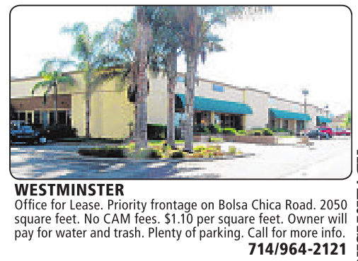 WESTMINSTER Office for Lease. Priority frontage on Bolsa Chica Road. 2050