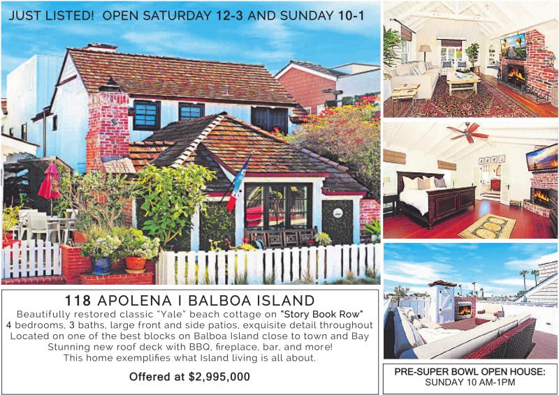 JUST LISTED! OPEN SATURDAY 12-3 AND SUNDAY 10-1 118 APOLENA I BALBOA ISLAND Beautifully restored classic “Yale” beach cottage on “Story Book Row” 4 bedrooms, 3 baths, large front and side patios, exquisite detail throughout Located on one of the best blocks on Balboa Island close to town and Bay Stunning new roof deck with BBQ, fireplace, bar, and more! This home exemplifies what Island living is all about. Offered at $2,995,000 PRE-SUPER BOWL OPEN HOUSE: SUNDAY 10 AM-1PM