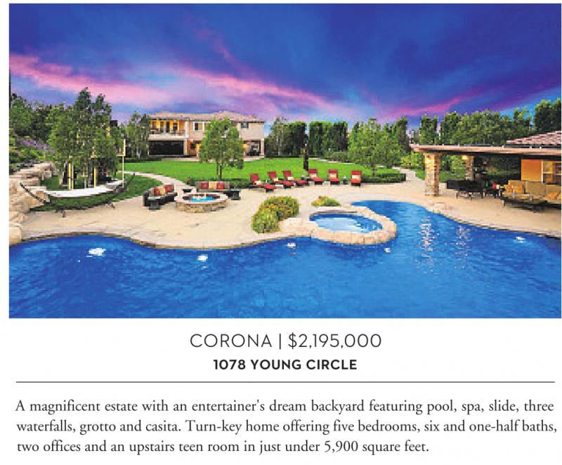 CORONA | $2,195,000 1078 YOUNG CIRCLE A magnificent estate with an entertainer's dream backyard featuring pool, spa, slide, three waterfalls, grotto and casita. Turn-key home offering five bedrooms, six and one-half baths, two offices and an upstairs teen room in just under 5,900 square feet.