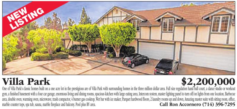 One of Villa Park’s classic homes built on aone acre lot in the prestigious are of Villa Park with surrounding homes in the three million dollar area. Full size regulation hand ball court, adance studio orworkout gym, afinished basement with afour car garage, enormous living and dining rooms, spacious kitchen with large eating area, Intercom system, master lighting panel to turn off/on lights from one location, Barbecue area, double oven, warming oven, microwave,trash compactor,4burner gas cooktop, Wetbar with ice maker,Parquet hardwood floors, 2laundry rooms up and down, Amazing master suite with sitting room, office, marble counter tops, spa tub, sauna, marble fireplace and balcony. Pool plus RVarea. Call RonAccornero (714) 396-7295