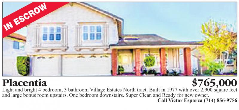 Placentia $765,000 Light and bright 4 bedroom, 3 bathroom Village Estates North tract. Built in 1977 with over 2,900 square feet and large bonus room upstairs. One bedroom downstairs. Super Clean and Ready for new owner. Call Victor Esparza (714) 856-9756