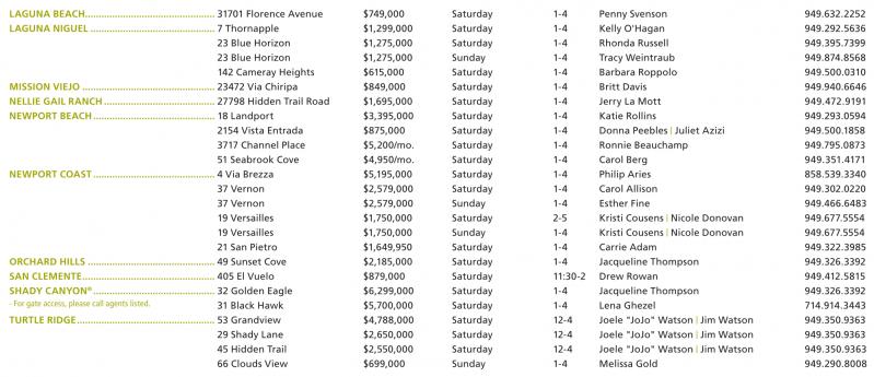 LAGUNA BEACH................................................ 31701 Florence Avenue $749,000 Saturday 1-4 Penny Svenson 949.632.2252 LAGUNA NIGUEL.............................................. 7 Thornapple $1,299,000 Saturday 1-4 Kelly O'Hagan 949.292.5636 23 Blue Horizon $1,275,000 Saturday 1-4 Rhonda Russell 949.395.7399 23 Blue Horizon $1,275,000 Sunday 1-4 Tracy Weintraub 949.874.8568 142 Cameray Heights $615,000 Saturday 1-4 Barbara Roppolo 949.500.0310 MISSION VIEJO ................................................. 23472 Via Chiripa $849,000 Saturday 1-4 Britt Davis 949.940.6646 NELLIE GAIL RANCH......................................... 27798 Hidden Trail Road $1,695,000 Saturday 1-4 Jerry La Mott 949.472.9191 NEWPORT BEACH............................................. 18 Landport $3,395,000 Saturday 1-4 Katie Rollins 949.293.0594 2154 Vista Entrada $875,000 Saturday 1-4 Donna Peebles | Juliet Azizi 949.500.1858 3717 Channel Place $5,200/mo. Saturday 1-4 Ronnie Beauchamp 949.795.0873 51 Seabrook Cove $4,950/mo. Saturday 1-4 Carol Berg 949.351.4171 NEWPORT COAST............................................. 4 Via Brezza $5,195,000 Saturday 1-4 Philip Aries 858.539.3340 37 Vernon $2,579,000 Saturday 1-4 Carol Allison 949.302.0220 37 Vernon $2,579,000 Sunday 1-4 Esther Fine 949.466.6483 19 Versailles $1,750,000 Saturday 2-5 Kristi Cousens | Nicole Donovan 949.677.5554 19 Versailles $1,750,000 Sunday 1-4 Kristi Cousens | Nicole Donovan 949.677.5554 21 San Pietro $1,649,950 Saturday 1-4 Carrie Adam 949.322.3985 ORCHARD HILLS ............................................... 49 Sunset Cove $2,185,000 Saturday 1-4 Jacqueline Thompson 949.326.3392 SAN CLEMENTE................................................. 405 El Vuelo $879,000 Saturday 11:30-2 Drew Rowan 949.412.5815 SHADY CANYON ® ............................................. 32 Golden Eagle $6,299,000 Saturday 1-4 Jacqueline Thompson 949.326.3392 -For gate access,pleasecallagentslisted. 31 Black Hawk $5,700,000 Saturday 1-4 Lena Ghezel 714.914.3443 TURTLE RIDGE................................................... 53 Grandview $4,788,000 Saturday 12-4 Joele "JoJo" Watson | Jim Watson 949.350.9363 29 Shady Lane $2,650,000 Saturday 12-4 Joele "JoJo" Watson | Jim Watson 949.350.9363 45 Hidden Trail $2,550,000 Saturday 12-4 Joele "JoJo" Watson | Jim Watson 949.350.9363 66 Clouds View $699,000 Sunday 1-4 Melissa Gold 949.290.8008