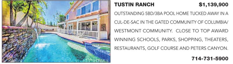 TUSTIN RANCH $1,139,900 OUTSTANDING 5BD/3BAPOOL HOME TUCKED AWAY IN A CUL-DE-SACINTHE GATED COMMUNITY OF COLUMBIA/ WESTMONT COMMUNITY. CLOSE TO TOP AWARD WINNING SCHOOLS, PARKS, SHOPPING, THEATERS, RESTAURANTS, GOLF COURSE AND PETERS CANYON. 714-731-5900