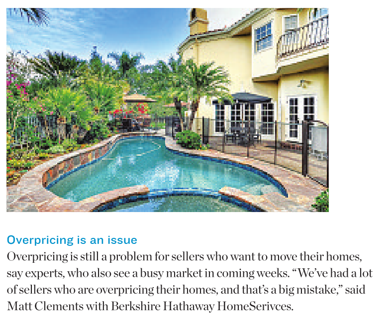Overpricing is an issue Overpricing is still aproblem for sellers who want to move theirhomes, sayexperts,who also seeabusymarketincoming weeks. “We’ve hadalot of sellers who areoverpricing their homes,and that’sabig mistake,”said Matt Clements with BerkshireHathaway HomeSerivces.