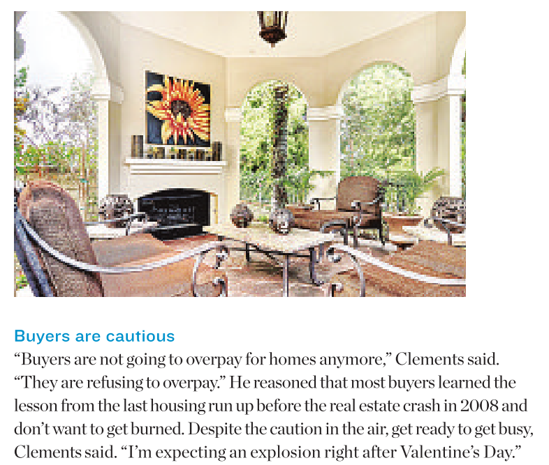 Buyers are cautious “Buyers arenot going to overpayfor homesanymore,” Clements said. “Theyare refusing to overpay.”Hereasoned that mostbuyers learned the lesson from the lasthousing run up beforethe real estate crash in 2008 and don’twanttoget burned. Despite the caution in the air,get ready to getbusy, Clements said.“I’mexpecting an explosion right after Valentine’sDay.”