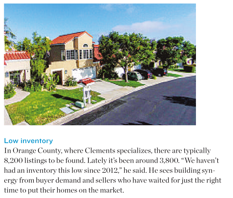 Low inventory In OrangeCounty, whereClements specializes,thereare typically 8,200 listings to be found. Latelyit’sbeenaround 3,800. “Wehaven’t had an inventory this lowsince 2012,”hesaid. He sees building synergy from buyer demand and sellers who have waited for justthe right time to put their homes on the market.
