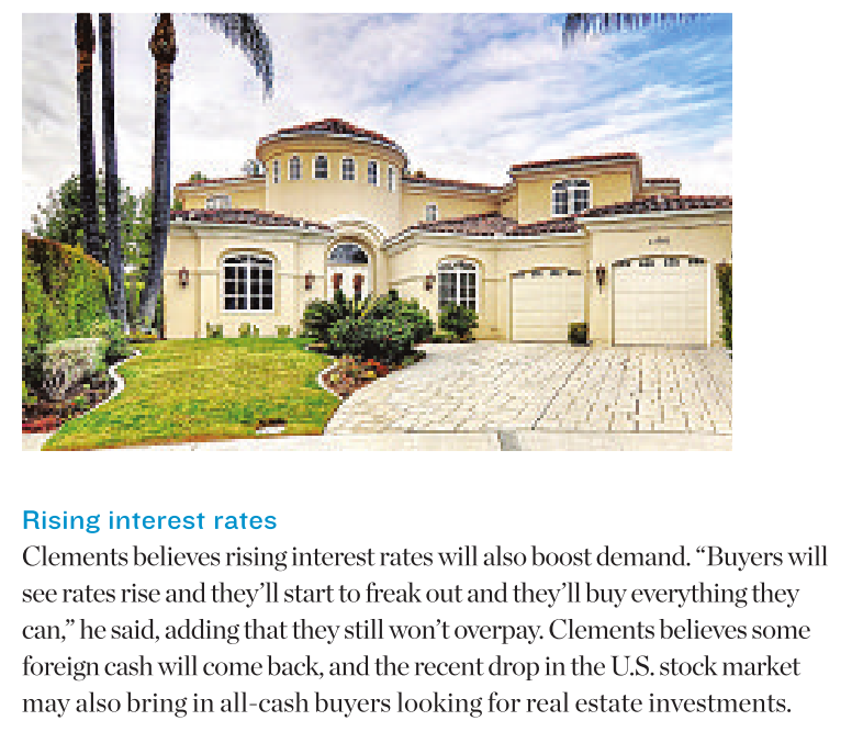 Rising interest rates Clements believesrising interestrates will also boost demand. “Buyers will see rates rise and they’ll starttofreak out and they’ll buy everything they can,”hesaid, adding that they still won’toverpay. Clements believessome foreign cash will come back, and the recent drop in the U.S. stockmarket mayalso bring in all-cash buyers looking for real estate investments.