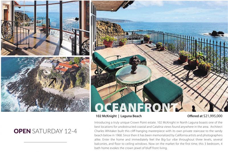 OPEN SATURDAY 12-4 OC O 102 McKnight | Laguna Beach Offered at $21,995,000 Introducing a truly unique Crown Point estate. 102 McKnight in North Laguna boasts one of the best locations for unobstructed coastal and Catalina views found anywhere in the area. Architect Charles Whitaker built this cliff-hanging masterpiece with its own private staircase to the sandy beach below in 1968. Since then it has been memorialized by California artists and photographers alike. Enter the home and immediately feel the Big-Sur vibe throughout three levels, several balconies, and floor to ceiling windows. Now on the market for the first time, this 3 bedroom, 4 bath home evokes the crown jewel of bluff front living.
