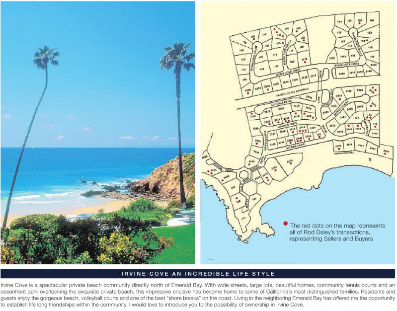 • The red dots on the map represents all of Rod Daley’s transactions, representing Sellers and Buyers I R V I N E C O V E A N I N C R E D I B L E L I F E S T Y L E Irvine Cove is a spectacular private beach community directly north of Emerald Bay. With wide streets, large lots, beautiful homes, community tennis courts and an oceanfront park overlooking the exquisite private beach, this impressive enclave has become home to some of California’s most distinguished families. Residents and guests enjoy the gorgeous beach, volleyball courts and one of the best “shore breaks” on the coast. Living in the neighboring Emerald Bay has offered me the opportunity to establish life long friendships within the community. I would love to introduce you to the possibility of ownership in Irvine Cove. See also