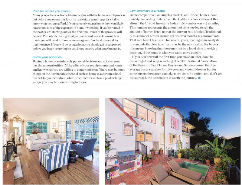 Prepare before you search Manypeople believe home buying begins with the home search process but beforeyou open your favorite real estate search app,it’svital to knowwhat youcan afford. If youcurrentlyown ahomethen youlikely have some idea of theexpenses of home ownership.Ifyou’verented in the pastorare starting out for the firsttime, much of this process will be new. Part of calculating what youcan affordisalsoknowing how much youwill need to have in an emergencyfund and reserved for maintenance. If youwill be using aloan, youshould getpreapproved beforeyou begin searching so youknowexactlywhat your budget is. Know your priorities Buying ahouse is an intenselypersonal decision and noteveryone has the same priorities. Makealistofyour requirements and wants and knowwhat youare willing to compromise on. Theremay be some things on the listthat areessential such as being in acertain school district for your children, while other factors such as apool or large garageyou maybemorewilling to forgo. Low inventory is a factor In the competitive Los Angeles market, well-priced homes move quickly. According to data from the California Association of Realtors,® the Unsold Inventory Index in November was 4.2 months. This number represents the amount of time needed to sell the amount of homes listed now at the current rate of sales. Traditionally this number hovers around six or seven months as a normal rate. That rate hasn’t been seen for several years, leading some analysts to conclude that low inventory may be the new reality. For buyers this means knowing that there may not be a lot of time to weigh a decision. If the home is what you want, move quickly. If you don’t prevail the first time you make an offer, don’t be discouraged and keep searching. The 2015 National Association of Realtors Profile of Home Buyers and Sellers showed that the average buyer searches for 10 weeks and views 10 homes but for some buyers the search can take more time. Be patient and don’t get discouraged, the destination is worth the journey.