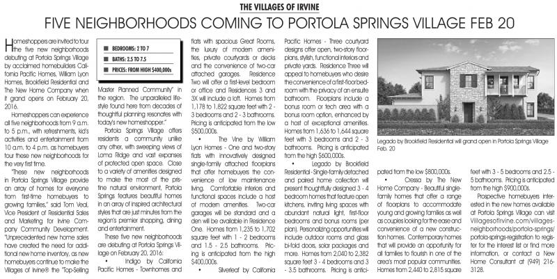 are invited to tour the five new neighborhoods debuting at Portola springs village by acclaimed homebuilders california Pacific homes, William lyon homes, brookfield residential and the new home company when it grand opens on February 20, 2016.