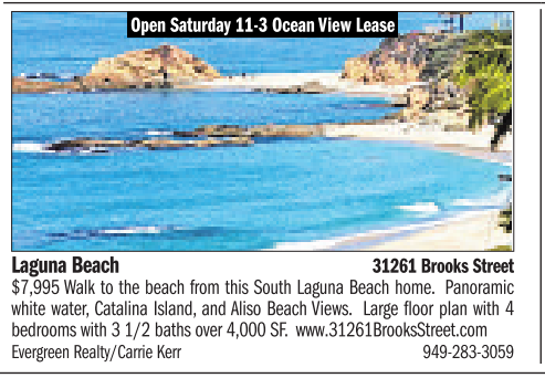 Laguna Beach 31261Brooks Street $7,995 Walk to the beach from this South Laguna Beach home. Panoramic white water,Catalina Island, and Aliso Beach Views. Large floor plan with 4 bedrooms with 31/2 baths over 4,000 SF. www.31261BrooksStreet.com EvergreenRealty/Carrie Kerr 949-283-3059