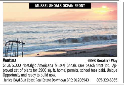 Ventura 6698Breakers Way $1,875,000 Nostalgic Americana Mussel Shoals rare beach front lot. Approved set of plans for 3900 sq. ft. home, permits, school fees paid. Unique Opportunity and ready to build now.