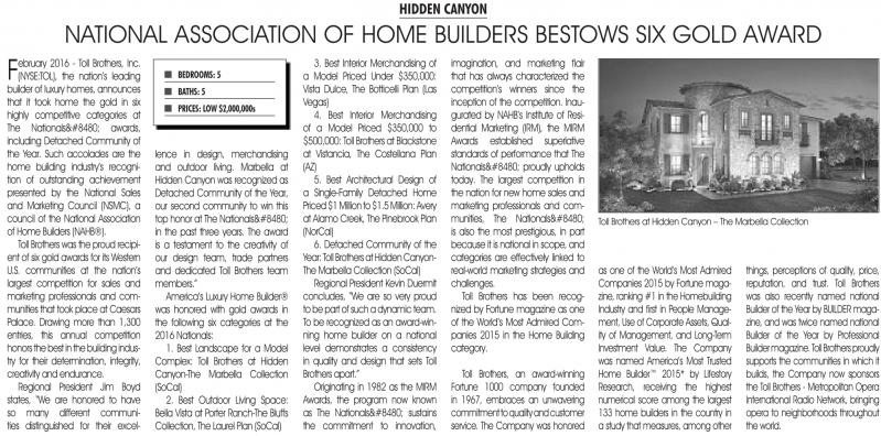 toll Brothers was the proud recipient of six gold awards for its western u.s. communities at the nation’s largest competition for sales and marketing professionals and communities that took place at caesars Palace. drawing more than 1,300 entries, this annual competition honors the best in the building industry for their determination, integrity, creativity and endurance.