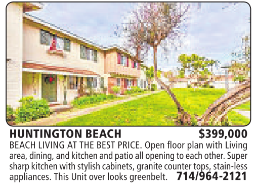 HUNTINGTON BEACH $399,000 BEACH LIVING AT THE BEST PRICE. Open floor plan with Living area,dining, andkitchen andpatio allopeningtoeachother.Super sharpkitchen with stylish cabinets,granitecountertops,stain-less appliances. This Unit overlooks greenbelt. 714/964-2121