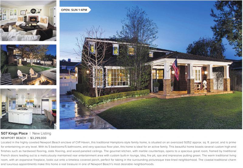NEWPORT BEACH | $3,299,000 Located in the highly coveted Newport Beach enclave of Cliff Haven, this traditional Hamptons-style family home, is situated on an oversized 9,052 approx. sq. ft. parcel, and is prime for entertaining on any level. With its 5 bedrooms/5 bathrooms, and very spacious floor plan, this home is ideal for an active family. This beautiful home boasts several custom high-end finishes such as hardwood flooring, slate flooring, and wood-paneled ceilings. The gourmet kitchen, with marble countertops, opens to a spacious great room, framed by traditional French doors leading out to a meticulously maintained rear entertainment area with custom built-in lounge, bbq, fire pit, spa and impressive putting green. The warm traditional living room, with an expansive fireplace, looks out onto a timeless covered porch, perfect for taking in the surrounding picturesque tree-lined neighborhood. The coastal-traditional charm and luxurious appointments make this home a real treasure in one of Newport Beach’s most desirable neighborhoods.