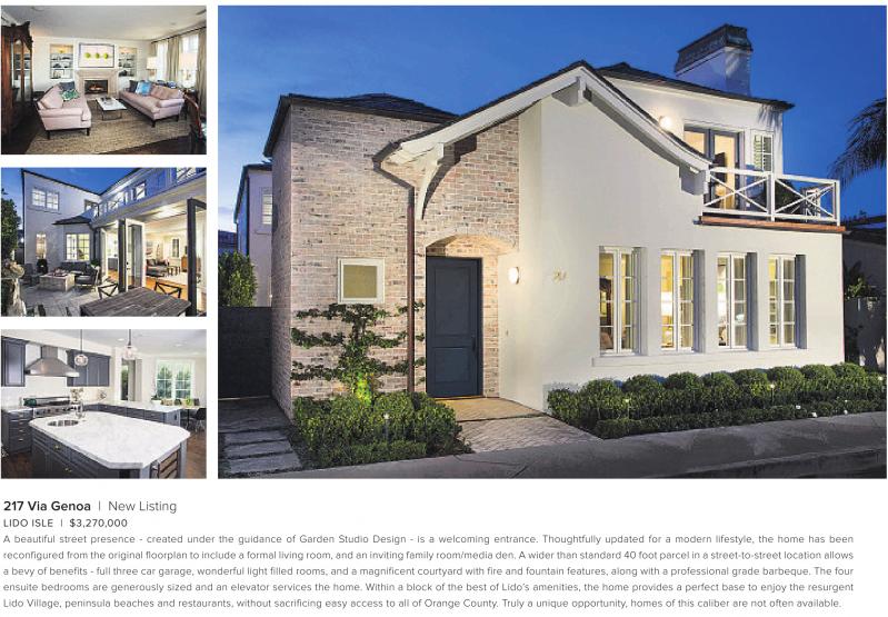 217 Via Genoa | New Listing LIDO ISLE | $3,270,000 A beautiful street presence - created under the guidance of Garden Studio Design - is a welcoming entrance. Thoughtfully updated for a modern lifestyle, the home has been reconfigured from the original floorplan to include a formal living room, and an inviting family room/media den. A wider than standard 40 foot parcel in a street-to-street location allows a bevy of benefits - full three car garage, wonderful light filled rooms, and a magnificent courtyard with fire and fountain features, along with a professional grade barbeque. The four ensuite bedrooms are generously sized and an elevator services the home. Within a block of the best of Lido’s amenities, the home provides a perfect base to enjoy the resurgent Lido Village, peninsula beaches and restaurants, without sacrificing easy access to all of Orange County. Truly a unique opportunity, homes of this caliber are not often available.