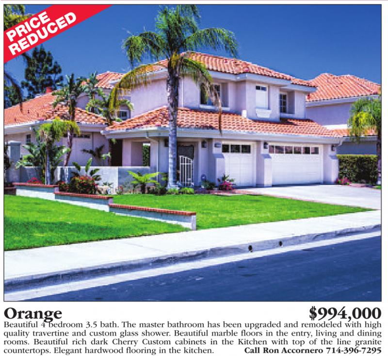 Orange $994,000 Beautiful 4 bedroom 3.5 bath. The master bathroom has been upgraded and remodeled with high quality travertine and custom glass shower. Beautiful marble floors in the entry, living and dining rooms. Beautiful rich dark Cherry Custom cabinets in the Kitchen with top of the line granite countertops. Elegant hardwood flooring in the kitchen. Call RonAccornero 714-396-7295