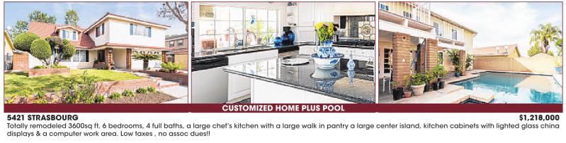 CUSTOMIZED HOME PLUS POOL 5421 STRASBOURG $1,218,000 Totally remodeled 3600sq ft, 6 bedrooms, 4 full baths, a large chef’s kitchen with a large walk in pantry a large center island, kitchen cabinets with lighted glass china displays & a computer work area. Low taxes , no assoc dues!!
