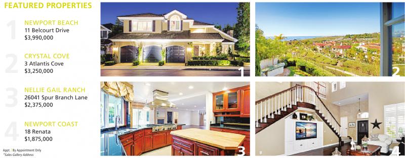 FEATURED PROPERTIES 1 NEWPORT BEACH 11 Belcourt Drive $3,990,000 2 CRYSTAL COVE 3 Atlantis Cove $3,250,000 3 NELLIE GAIL RANCH 26041 Spur Branch Lane $2,375,000 4 NEWPORT COAST 18 Renata $1,875,000 Appt. | By AppointmentOnly *Sales GalleryAddress See also