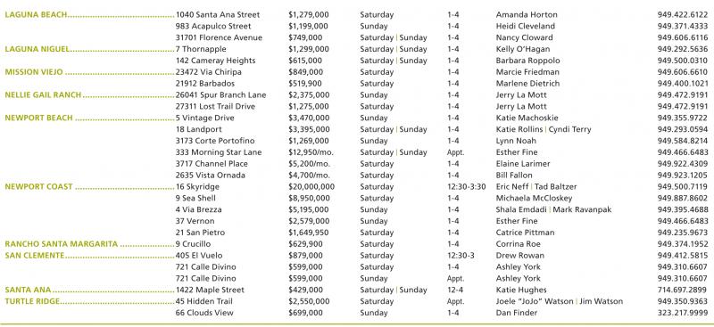 LAGUNA BEACH...........................................1040 Santa Ana Street $1,279,000 Saturday 1-4 Amanda Horton 949.422.6122 983 Acapulco Street $1,199,000 Sunday 1-4 Heidi Cleveland 949.371.4333 31701 Florence Avenue $749,000 Saturday | Sunday 1-4 Nancy Cloward 949.606.6116 LAGUNA NIGUEL..........................................7 Thornapple $1,299,000 Saturday | Sunday 1-4 Kelly O’Hagan 949.292.5636 142 Cameray Heights $615,000 Saturday | Sunday 1-4 Barbara Roppolo 949.500.0310 MISSION VIEJO ............................................23472 Via Chiripa $849,000 Saturday 1-4 Marcie Friedman 949.606.6610 21912 Barbados $519,900 Saturday 1-4 Marlene Dietrich 949.400.1021 NELLIE GAIL RANCH.....................................26041 Spur Branch Lane $2,375,000 Sunday 1-4 Jerry La Mott 949.472.9191 27311 Lost Trail Drive $1,275,000 Saturday 1-4 Jerry La Mott 949.472.9191 NEWPORT BEACH ........................................5 Vintage Drive $3,470,000 Sunday 1-4 Katie Machoskie 949.355.9722 18 Landport $3,395,000 Saturday | Sunday 1-4 Katie Rollins | Cyndi Terry 949.293.0594 3173 Corte Portofino $1,269,000 Sunday 1-4 Lynn Noah 949.584.8214 333 Morning Star Lane $12,950/mo. Saturday | Sunday Appt. Esther Fine 949.466.6483 3717 Channel Place $5,200/mo. Saturday 1-4 Elaine Larimer 949.922.4309 2635 Vista Ornada $4,700/mo. Saturday 1-4 Bill Fallon 949.923.1205 NEWPORT COAST ........................................16 Skyridge $20,000,000 Saturday 12:30-3:30 Eric Neff | Tad Baltzer 949.500.7119 9 Sea Shell $8,950,000 Saturday 1-4 Michaela McCloskey 949.887.8602 4 Via Brezza $5,195,000 Sunday 1-4 Shala Emdadi | Mark Ravanpak 949.395.4688 37 Vernon $2,579,000 Sunday 1-4 Esther Fine 949.466.6483 21 San Pietro $1,649,950 Saturday 1-4 Catrice Pittman 949.235.9673 RANCHO SANTA MARGARITA ......................9 Crucillo $629,900 Saturday 1-4 Corrina Roe 949.374.1952 SAN CLEMENTE............................................405 El Vuelo $879,000 Saturday 12:30-3 Drew Rowan 949.412.5815 721 Calle Divino $599,000 Saturday 1-4 Ashley York 949.310.6607 721 Calle Divino $599,000 Sunday Appt. Ashley York 949.310.6607 SANTA ANA.................................................1422 Maple Street $429,000 Saturday | Sunday 12-4 Katie Hughes 714.697.2899 TURTLE RIDGE..............................................45 Hidden Trail $2,550,000 Saturday Appt. Joele “JoJo” Watson | Jim Watson 949.350.9363 66 Clouds View $699,000 Sunday 1-4 Dan Finder 323.217.9999