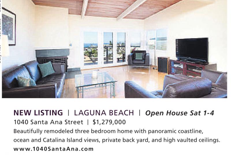 NEW LISTING | LAGUNA BEACH | Open House Sat 1-4 1040 Santa Ana Street | $1,279,000 Beautifully remodeled three bedroom home with panoramic coastline, ocean and Catalina Island views, private back yard, and high vaulted ceilings. www.1040SantaAna.com See also