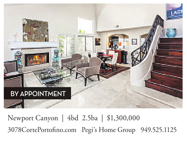 Newport Canyon | 4bd 2.5ba | $1,300,000 3078CortePortofino.com Pegi’s Home Group 949.525.1125