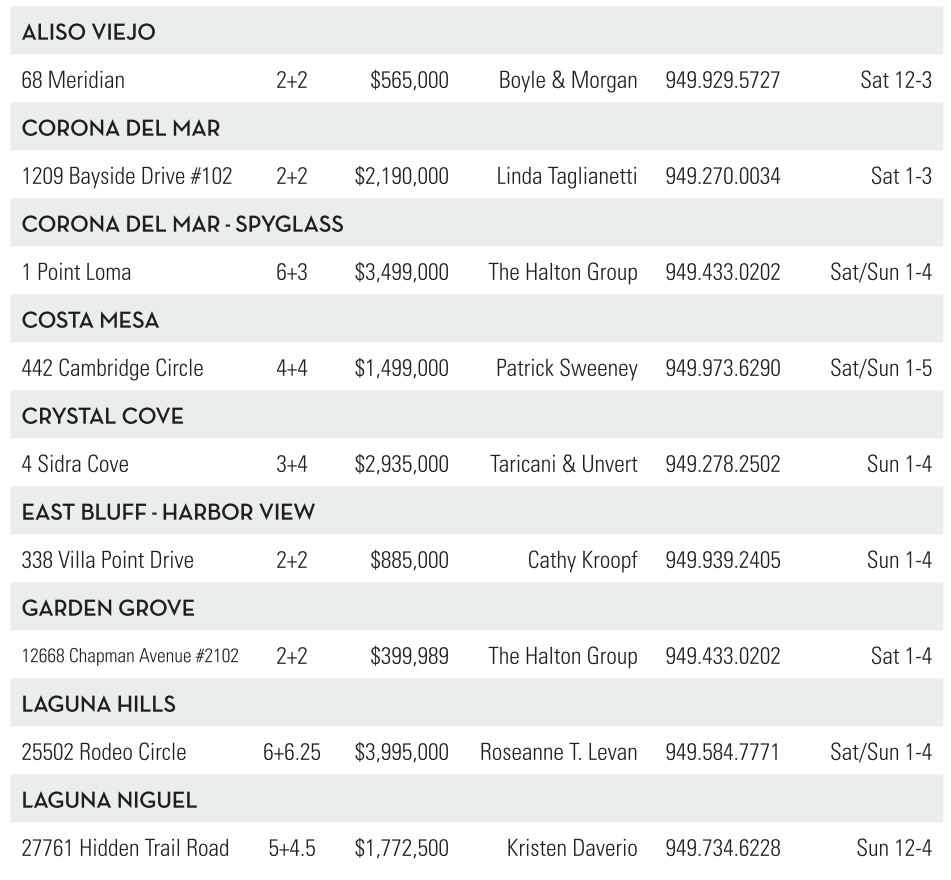 68 Meridian 2+2 $565,000 Boyle &Morgan 949.929.5727 Sat 12-3
