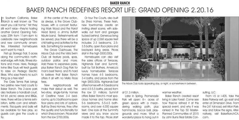 southern california, Baker ranch is well known as “the resort you call home.” Yet they still won’t relax—they’re hosting another Grand opening february 20th from 11am-4pm to celebrate new neighborhoods and new community amenities. interested homebuyers