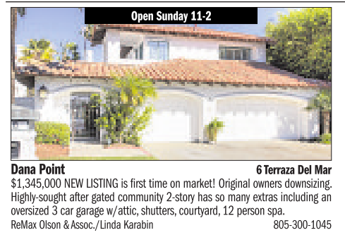 Dana Point 6Terraza Del Mar $1,345,000 NEW LISTING is first time on market! Original owners downsizing. Highly-sought after gated community 2-story has so many extras including an oversized 3car garage w/attic, shutters, courtyard, 12 person spa. ReMax Olson &Assoc./Linda Karabin 805-300-1045