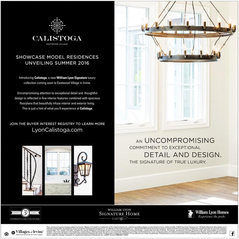SHOWCASE MODEL RESIDENCES UNVEILING SUMMER 2016 Introducing Calistoga,anew WilliamLyon Signature luxury collection coming soon to EastwoodVillage in Irvine. Uncompromising attention to exceptional detail and thoughtful designisreflected in fine interior features combinedwith spacious floorplans thatbeautifully infuse interior andexterior living. This is just ahint of whatyou’ll experience at Calistoga. JOIN THE BUYER INTEREST REGISTRY TO LEARN MORE LyonCalistoga.com AN UNCOMPROMISING COMMITMENT TO EXCEPTIONAL DETAIL AND DESIGN. THE SIGNATURE OF TRUE LUXURY. Plan, pricingand squarefootage subjecttochange. Villages of Irvine® is atrademark of The IrvineCompany LLC, usedfor marketing villages of new homes inIrvine, CaliforniaUSA. ©2016 TheIrvineCompanyLLC.All Rights Reserved.All projects are in planned communitiesdeveloped by IrvineCommunityDevelopmentCompany LLC, an affiliate of TheIrvine CompanyLLC.“MasterfullyPlannedbythe IrvineCompany”means thatthe Irvine Company created the masterland plan for all Irvine Company communities. The “master land plan”includes the overall entitlement and design of eachcommunity but does notinclude the design, construction andsale of homes.The design,construction and sale of homes is the soleresponsibilityofcommunity builders.The Irvine Company is not designing, constructing or offering homes for saleinany community.Models do notreflectracial preference.Inour continuing policyofresearchand improvement,WilliamLyon Homesreservesthe right to change product, design specifications, materials, prices and terms withoutpriornotice. Product type is subjecttoavailability.Prices effectiveasofdateofpublication. Photos shownare not actual photosofthe Calistoga homes. Rendering is an artist’sconception and is subject to change. Facebookisaregistered trademarkofFacebook, Inc. CalBRELicense#00982816. 3/2016