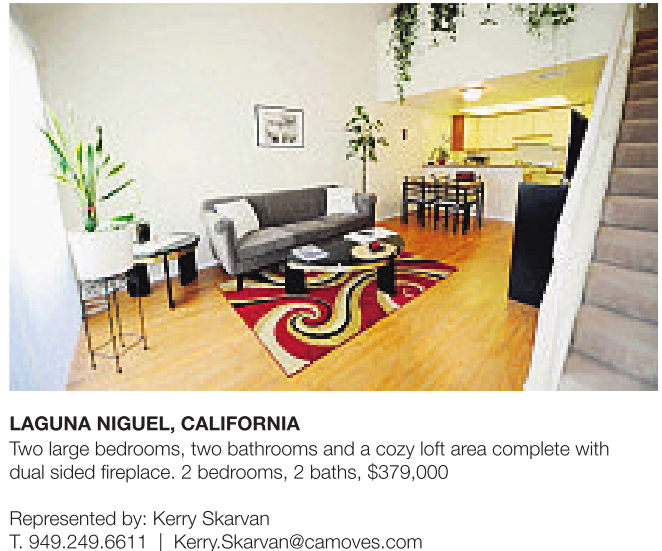 LAGUNA NIGUEL, CALIFORNIA Twolarge bedrooms, two bathrooms and acozy loft area complete with dual sided fireplace. 2bedrooms, 2baths, $379,000