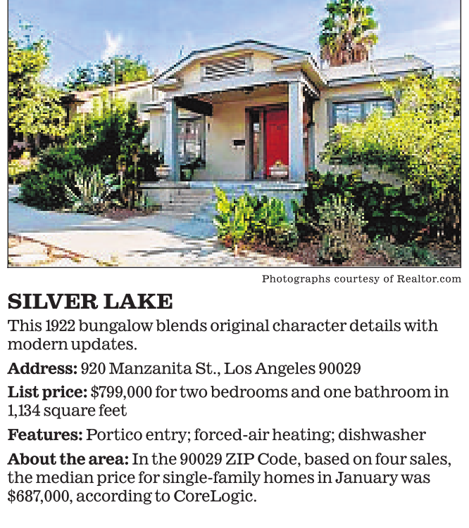 SILVER LAKE This 1922 bungalow blends original character details with modern updates. Address: 920 Manzanita St., Los Angeles 90029 Photographs courtesy of Realtor.com List price: $799,000 for two bedrooms and one bathroom in 1,134 square feet Features: Portico entry; forced-air heating; dishwasher About the area: In the 90029 ZIP Code, based on four sales, the median price for single-family homes in January was $687,000, according to CoreLogic.