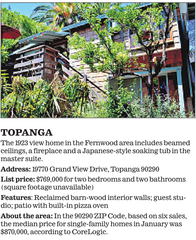 TOPANGA The 1923 view home in the Fernwood area includes beamed ceilings, a fireplace and a Japanese-style soaking tub in the master suite. Address: 19770 Grand View Drive, Topanga 90290 List price: $769,000 for two bedrooms and two bathrooms (square footage unavailable) Features: Reclaimed barn-wood interior walls; guest studio; patio with built-in pizza oven About the area: In the 90290 ZIP Code, based on six sales, the median price for single-family homes in January was $870,000, according to CoreLogic.