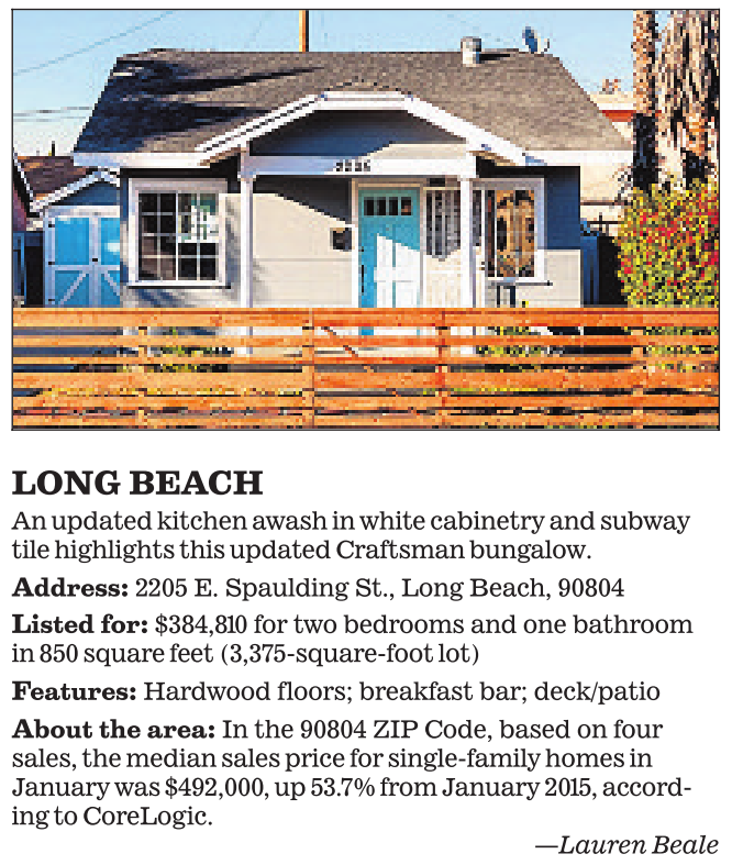 LONG BEACH An updated kitchen awash in white cabinetry and subway tile highlights this updated Craftsman bungalow. Address: 2205 E. Spaulding St., Long Beach, 90804 Listed for: $384,810 for two bedrooms and one bathroom in 850 square feet (3,375-square-foot lot) Features: Hardwood floors; breakfast bar; deck/patio About the area: In the 90804 ZIP Code, based on four sales, the median sales price for single-family homes in January was $492,000, up 53.7% from January 2015, according to CoreLogic. —Lauren Beale